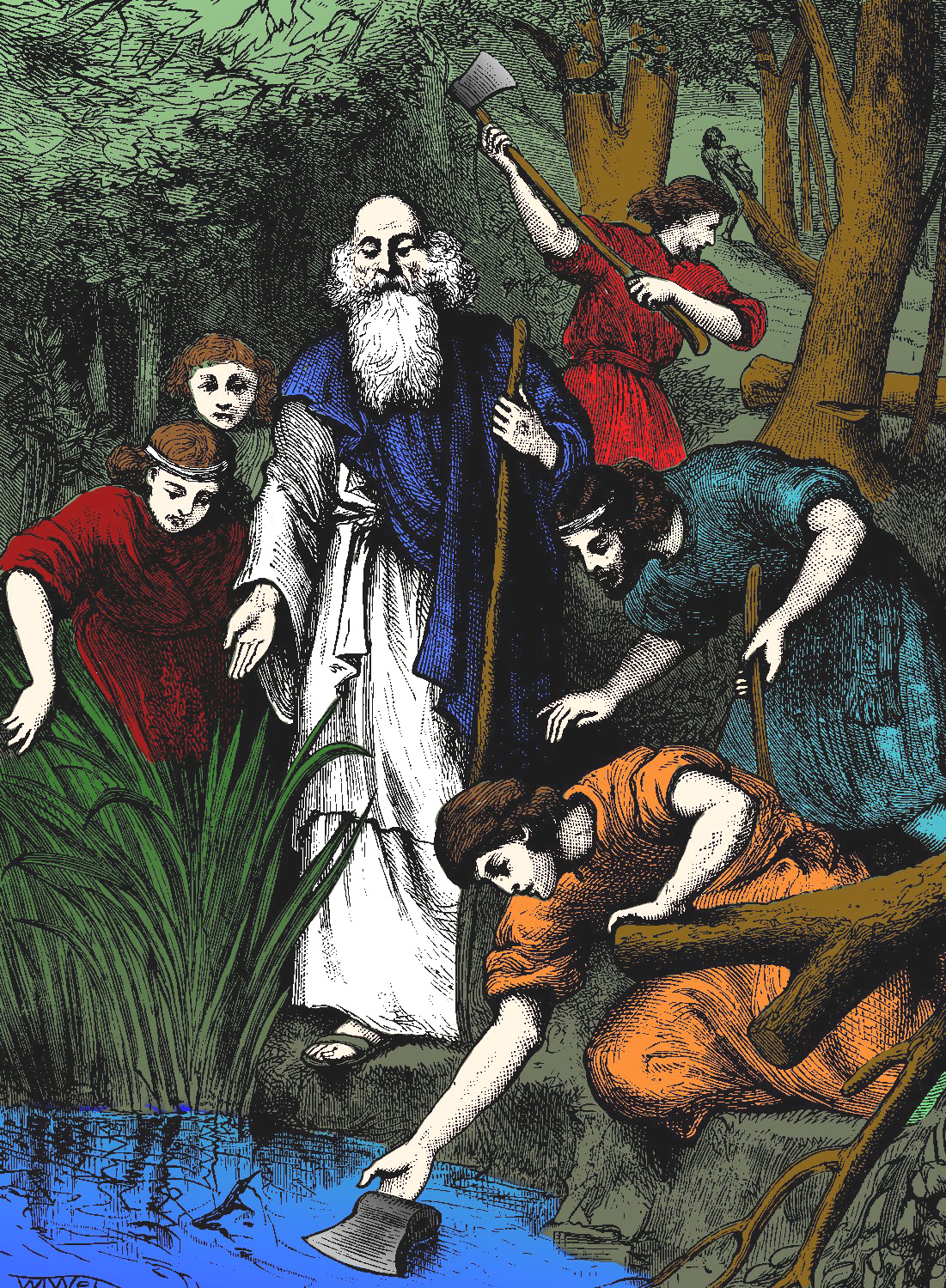 A tanítványok fejszéjüket fogva Elizeussal együtt lesétáltak a Jordán-folyóhoz.