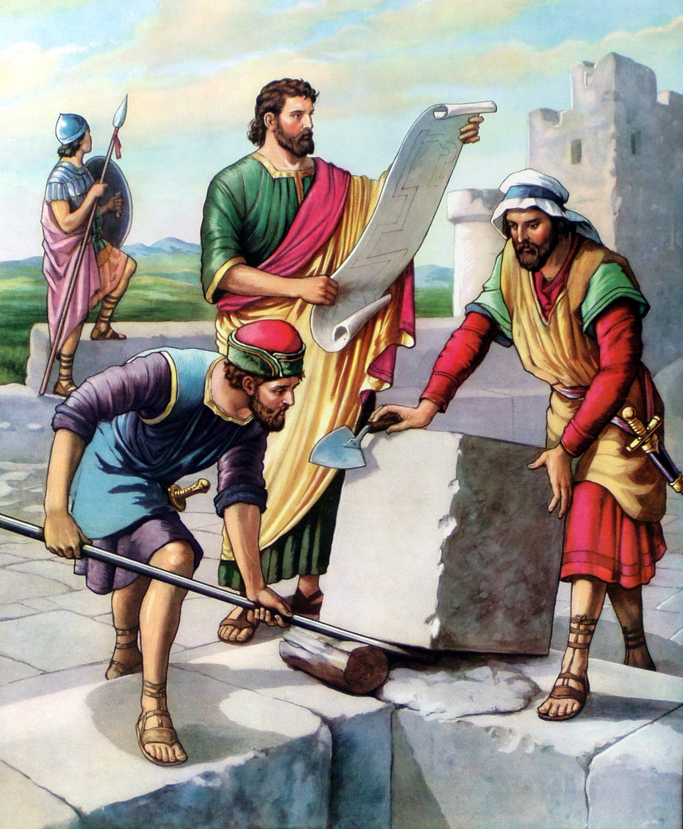 építőmunkások a helyükre emelik a hatalmas alapköveket. Ezsd 3:10-11.