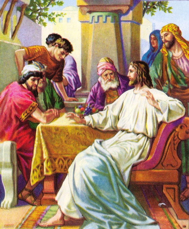 egy vezető farizeus otthonában tanított. Szombatnapi ebédre hívták oda. Tanításai rádöbbentették a vendégeket,