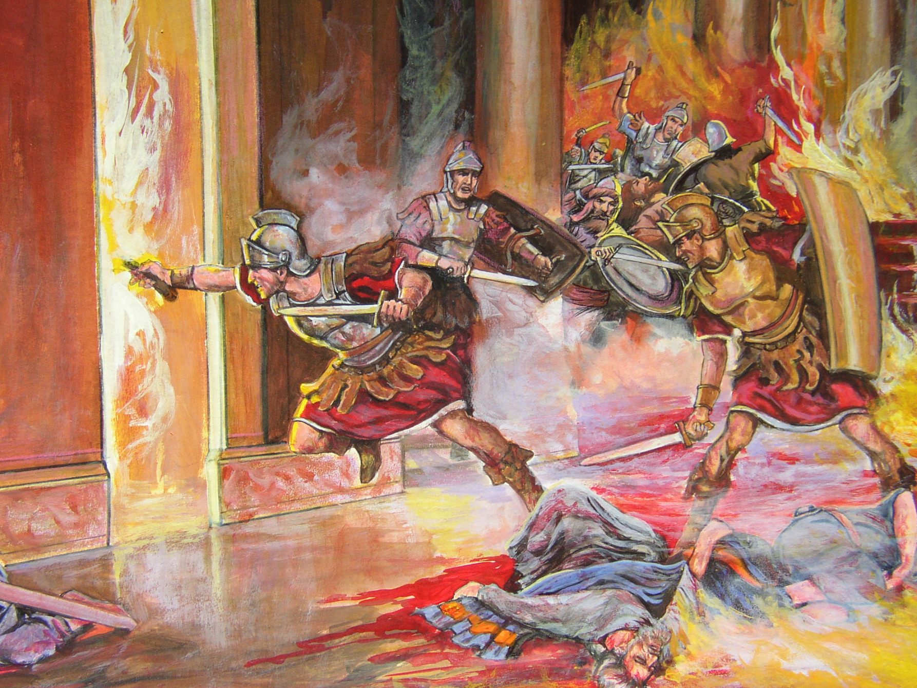 Isten védelmében reménykedve. Miközben lángok emésztették az egykor szent épületet, a római katonák zsákmányként