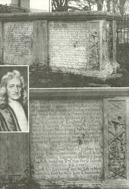 Dr. Peter Chamberlen, I. Jakab, I. Károly és II. Károly és királynőik orvosa, 32 évig volt szombatünneplő, amint azt lenyűgöző sirkövére feljegyezték.Rendíthetetlen volt azon idők természettudósai között. (alul) Életrajzi nyilatkozatának összevont története.
